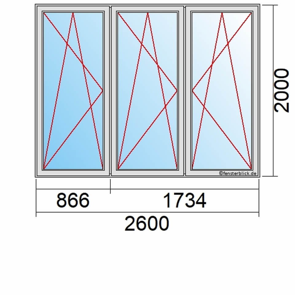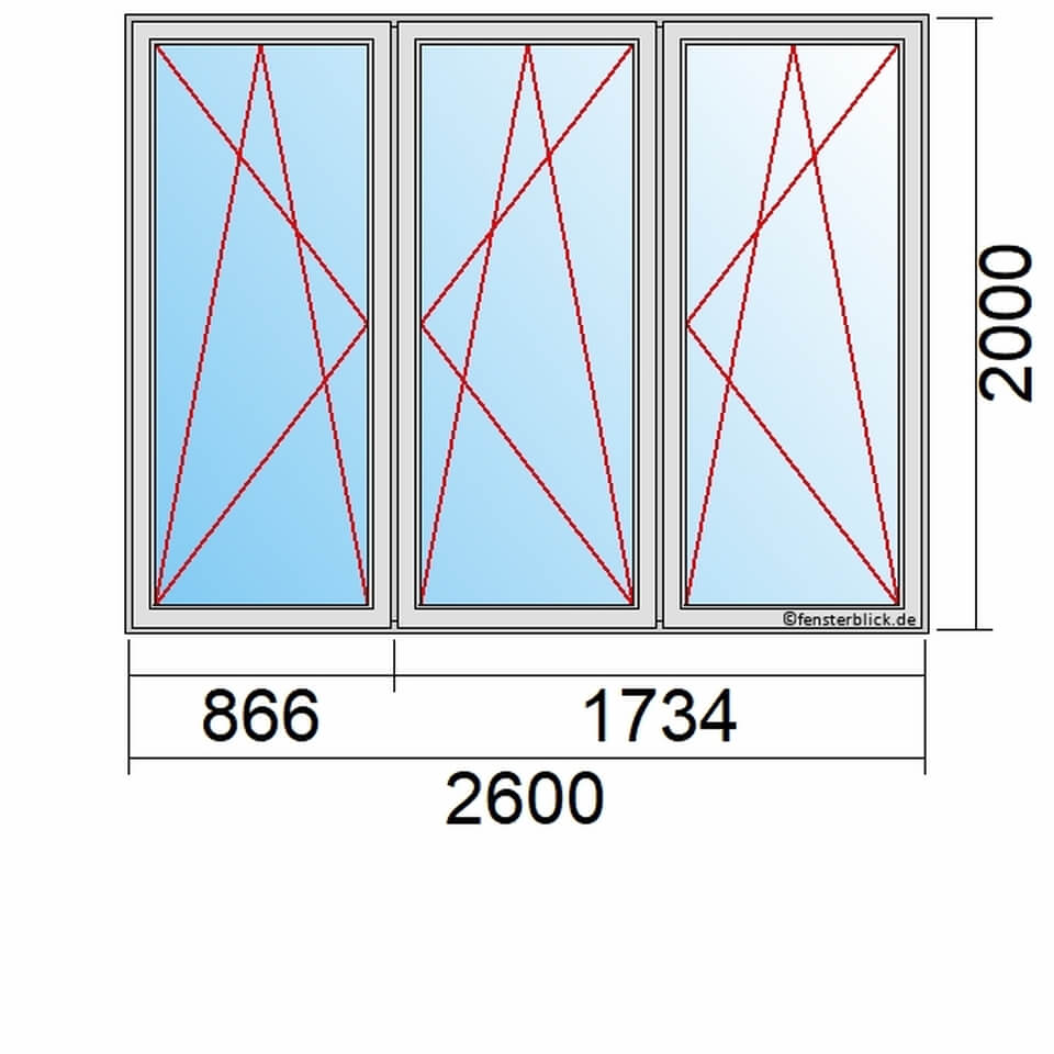 Eine Balkontür mit einer Breite von 2600 mm kann verschiedene Öffnungsrichtungen haben. Die fünf Optionen sind: Festverglasung, Dreh Öffnung, Dreh-Kipp Öffnung, Parallel-Schiebe-Kipp (PSK= Öffnung oder Hebe-Schiebe (HS) Öffnung. Die Dreh-Kipp Balkontür-Öffnung ist der Standard und besonders beliebt. Weiter zu Balkontürtypen und Öffnungsrichtungen